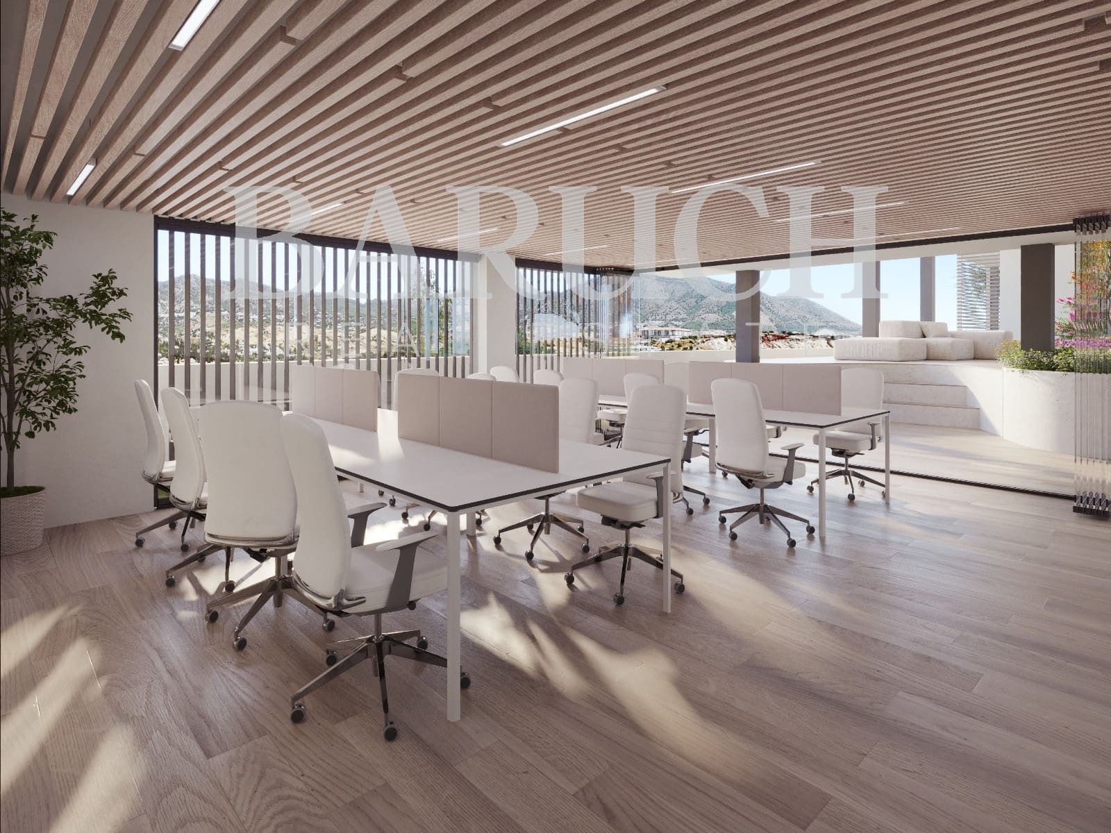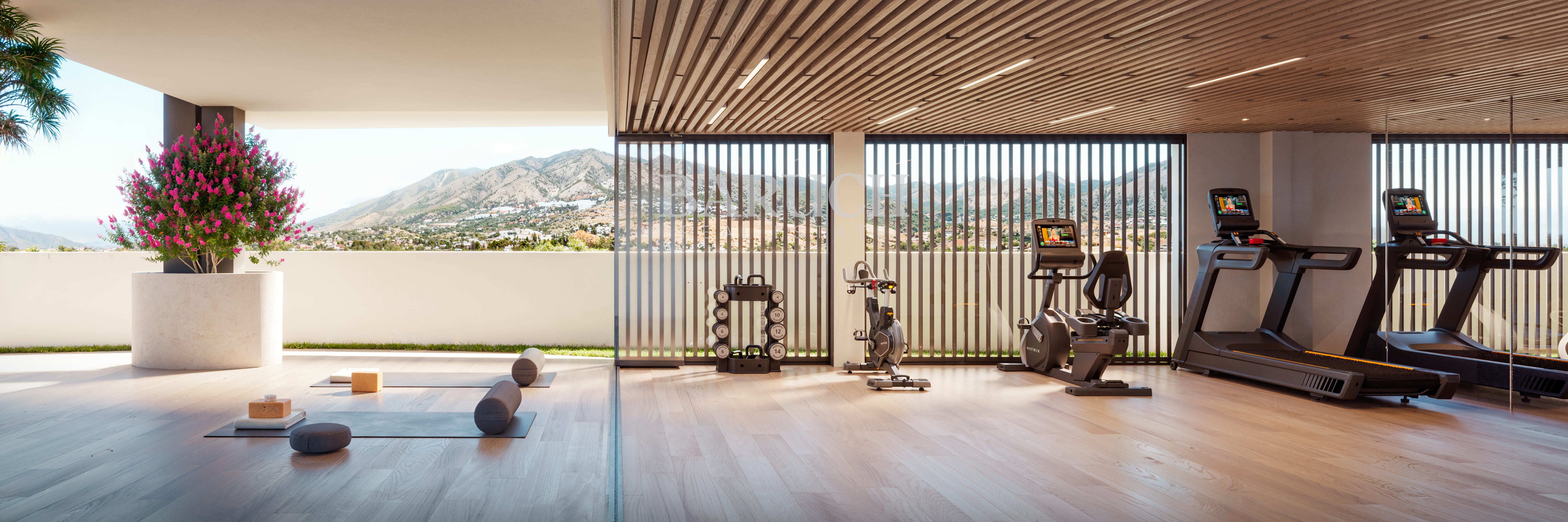 Open spaces with greenery and seating areas overlooking the Sierra de Mijas.