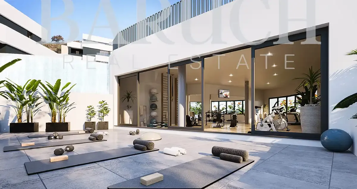 MedBlue Marbella is a unique project whose architecture blends perfectly with the surrounding natural landscape. Residents can enjoy outstanding leisure and wellness facilities, including beautifully landscaped gardens, an outdoor swimming pool, a heated indoor pool, a fully equipped gym, a pool bar, spa area and a co working space.