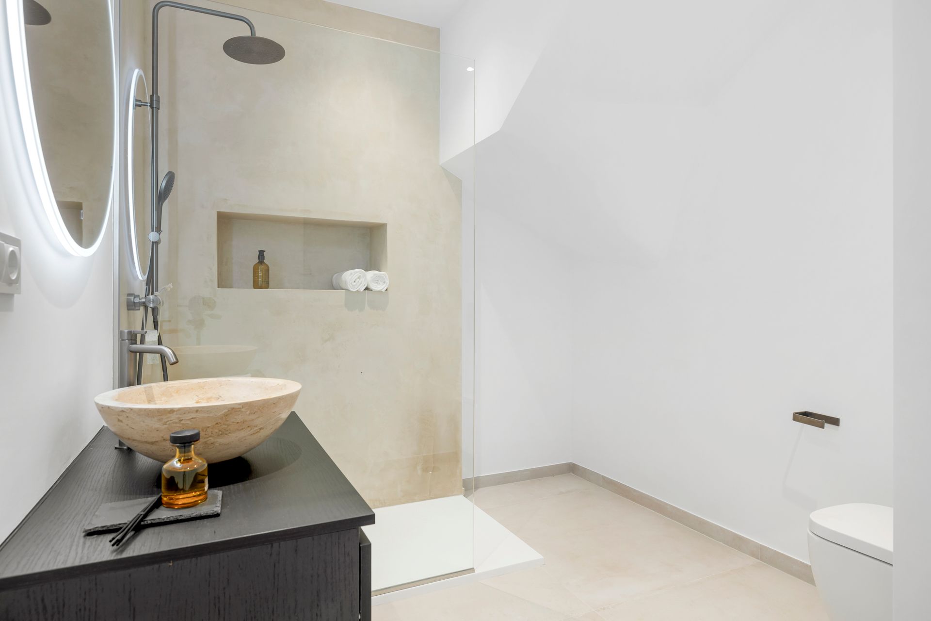 Upstairs, you will find two cosy bedrooms, each with their own bathroom, and a terrace offering pleasant, open views.
